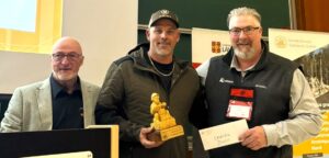 Alexandre Boutin recevant le prix de la relève des mains d’Harold Blackburn (à gauche) et d’Eric Simon (à droite), directeurs et responsables du comité boutefeu au sein de la SEEQ